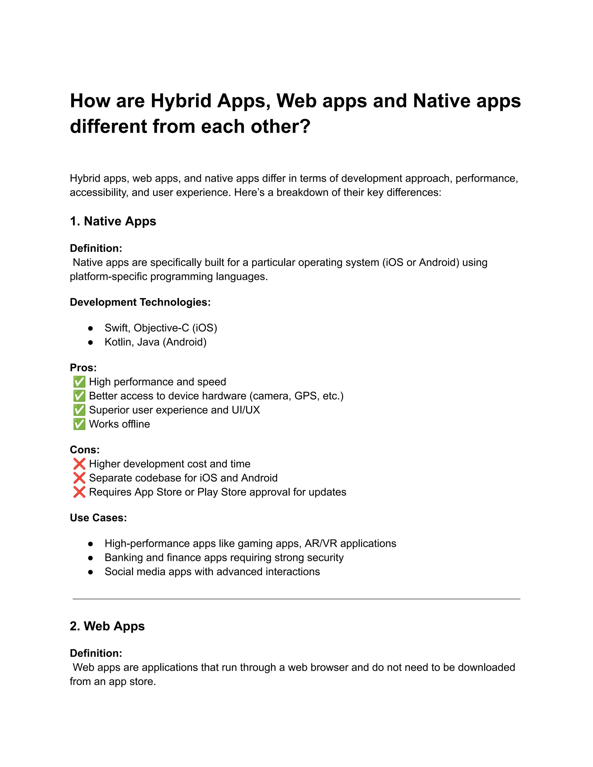 Hybrid app development combines elements of both native and web apps, allowing a single codebase to run across multiple platforms. Unlike native apps, which are built specifically for iOS or Android, hybrid apps use web technologies wrapped in a native shell, enabling cost-effective and faster development. Compared to web apps, hybrid apps offer better performance, offline functionality, and access to device features. This approach is ideal for businesses looking to balance performance, development speed, and budget while reaching a broader audience.
