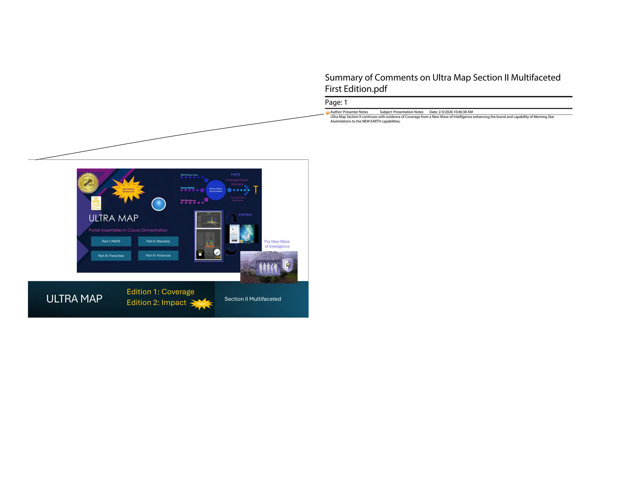 This document “Ultra Map, Section II” highlights the integration of advanced virtual technologies such as VP-A for remote construction, the positive industry response in Europe and the U.S., and the growing importance of automated, aesthetically designed solutions. It discusses future developments in VP-A education, new industry partnerships, and innovations in photosynthetic packaging, cloud banking, and encryption methods. Additionally, the document emphasizes franchise licensing models, subscription economies, and the ongoing optimization of supply chains and secure financial operations within the glass construction and warehouse sectors.