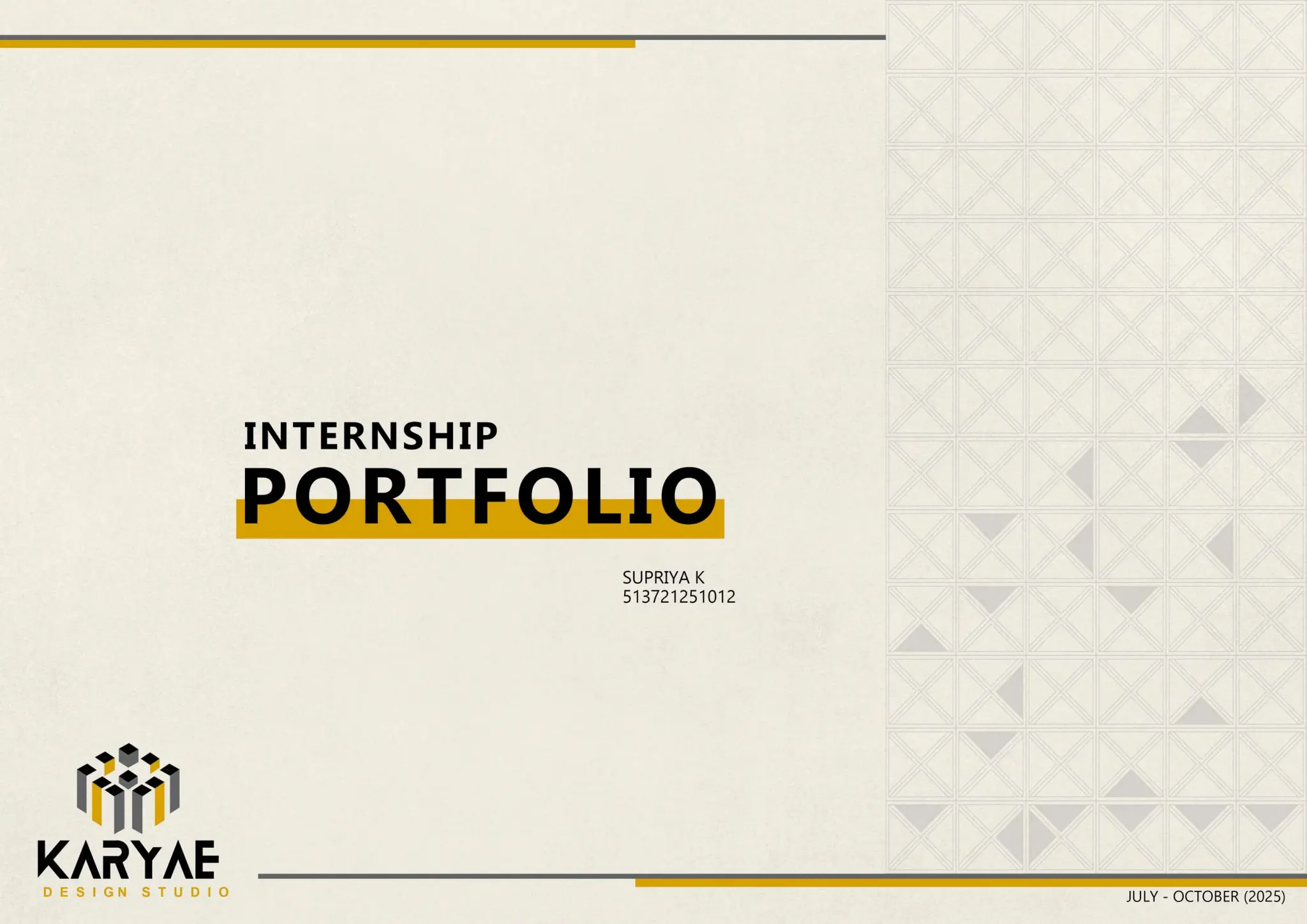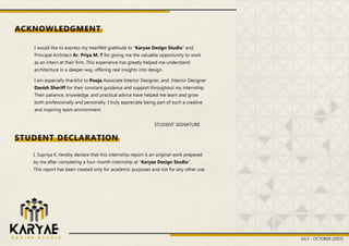 Completed my architectural internship at Karyae Design Studio, Bengaluru, where I worked on residential and interior design projects from concept development to execution drawings. Assisted in spatial planning, layout refinement, and preparation of detailed working drawings for on-site implementation.
