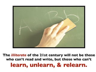This document discusses literacy and its importance. It defines literacy as not just the ability to read and write but to learn, unlearn, and relearn in the digital age. It emphasizes that literacy is a human right that allows one to understand complex messages, convey meaning, and rally others. It promotes developing habits and attitudes like imagination, curiosity, and adaptability to succeed in both school and the modern world.