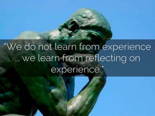 The document emphasizes the significance of critical reflection in the learning process, positing it as an active and intellectual exercise essential for deeper understanding and inspiration. It cites research indicating that reflection enhances learning by making experiences productive and increasing self-efficacy. Various means of reflection are suggested, including discussion, writing, and multimedia, alongside reflection questions to guide learning experiences.